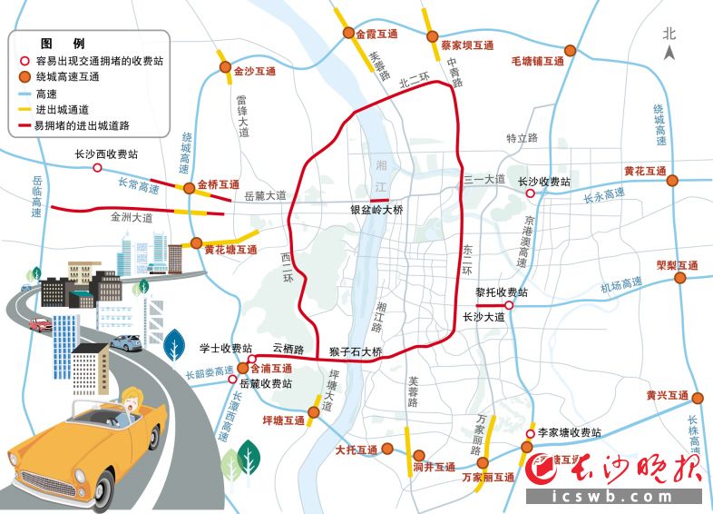 市公安局交警支隊民警羅劍鋒告訴記者,清明小長假期間,京港澳高速長沙收費站、黎托收費站、李家塘收費站,長潭高速學(xué)士收費站,長張高速長沙西收費站,長韶婁高速岳麓收費站等高速公路出入口容易出現(xiàn)交通擁堵;最易擁堵的進(jìn)出城道路則主要是猴子石大橋、岳麓大道、云棲路、銀盆嶺大橋、長沙大道、二環(huán)線、金洲大道。