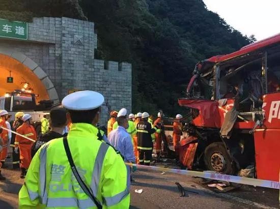 2017年8月10日23點34分,一輛號牌為豫C88858號客車(紅色宇通客車,2011年12月19日出廠,檢驗有效期至2018年1月31日,機動車所有人為洛陽交通運輸集團有限公司,核載51人,實載49人)自成都駛往洛陽,途經(jīng)京昆高速公路西安方向秦嶺一號隧道南口(1164km+930m),撞向隧道口發(fā)生交通事故。目前,自現(xiàn)場事故搶救出人員49人,其中36人死亡(成人34人,男26人,女8人,兒童男女共2人,受傷13人(已全部送往臨近醫(yī)院救治)。